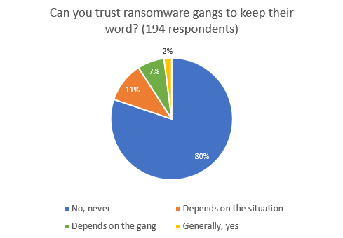 Across both events, attendees reported a strong mistrust of ransomware gangs, with four in five saying that you can never trust them to keep their word. Just 2% feel that you can generally trust ransomware actors.