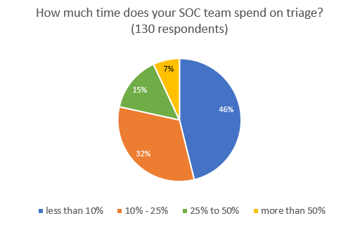 Within the SOC, alert triage is a key task for many human operators. Over half (54%) of poll respondents reported that their SOC team spends 10% or more of their time on triage, with almost a quarter (22%) spending 25% or more of their time on this activity.