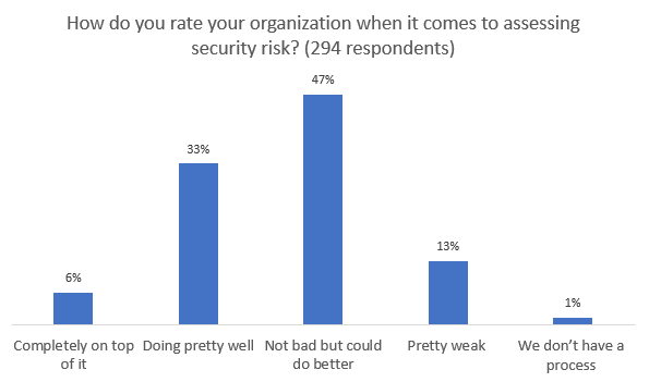 When it comes to assessing security risk, almost half (47%) of the attendees rated their organization as Not bad but could do better. One third feel that they are doing pretty well and 6% are completely on top of it. The results we very similar across both events, revealing that security risk assessment maturity is generally consistent across different geographic regions.