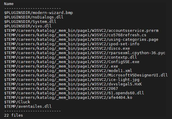 In the sample above, for example, the files in $TEMP/careers are a curious mixture of non-malicious files of many types; the files in $PLUGINSDIR are legitimate addons for NSIS itself; the curiously named file $TEMP/Cluck is a scrambled BLOB of malware that looks like random data; and $TEMP/aventailes.dll is the actual malware that will run during “installation”.