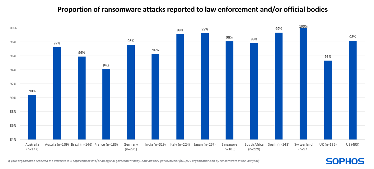 A livello globale, il 97% delle vittime di ransomware nell’ultimo anno ha segnalato l’attacco alle forze dell’ordine e/o a enti ufficiali. I tassi di segnalazione sono elevati in tutti i Paesi esaminati, con appena dieci punti percentuali tra il tasso più basso (90% – Australia) e quello più alto (100% – Svizzera).