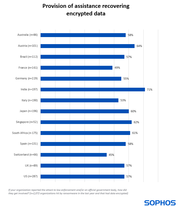 Scendendo più in profondità, si nota che l’esatta natura del coinvolgimento delle forze dell’ordine e/o degli enti ufficiali varia a seconda della sede dell’organizzazione. Mentre più della metà delle vittime ha ricevuto consigli su come affrontare l’attacco in tutti i Paesi presi in esame, le organizzazioni in India (71%) e a Singapore (69%) hanno riportato il livello più alto di supporto in questo ambito.