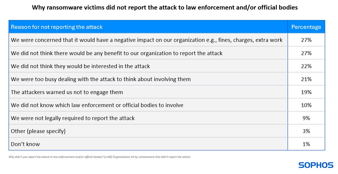 Le ragioni per cui il 3% (86 intervistati) non ha segnalato l’attacco sono state molteplici: le due più comuni sono state la preoccupazione di un impatto negativo sull’organizzazione, come multe, addebiti o lavoro extra (27%), e la convinzione che non ci sarebbe stato alcun vantaggio (27%). Diversi intervistati hanno dichiarato testualmente di non essersi rivolti a enti ufficiali perché erano in grado di risolvere il problema internamente.