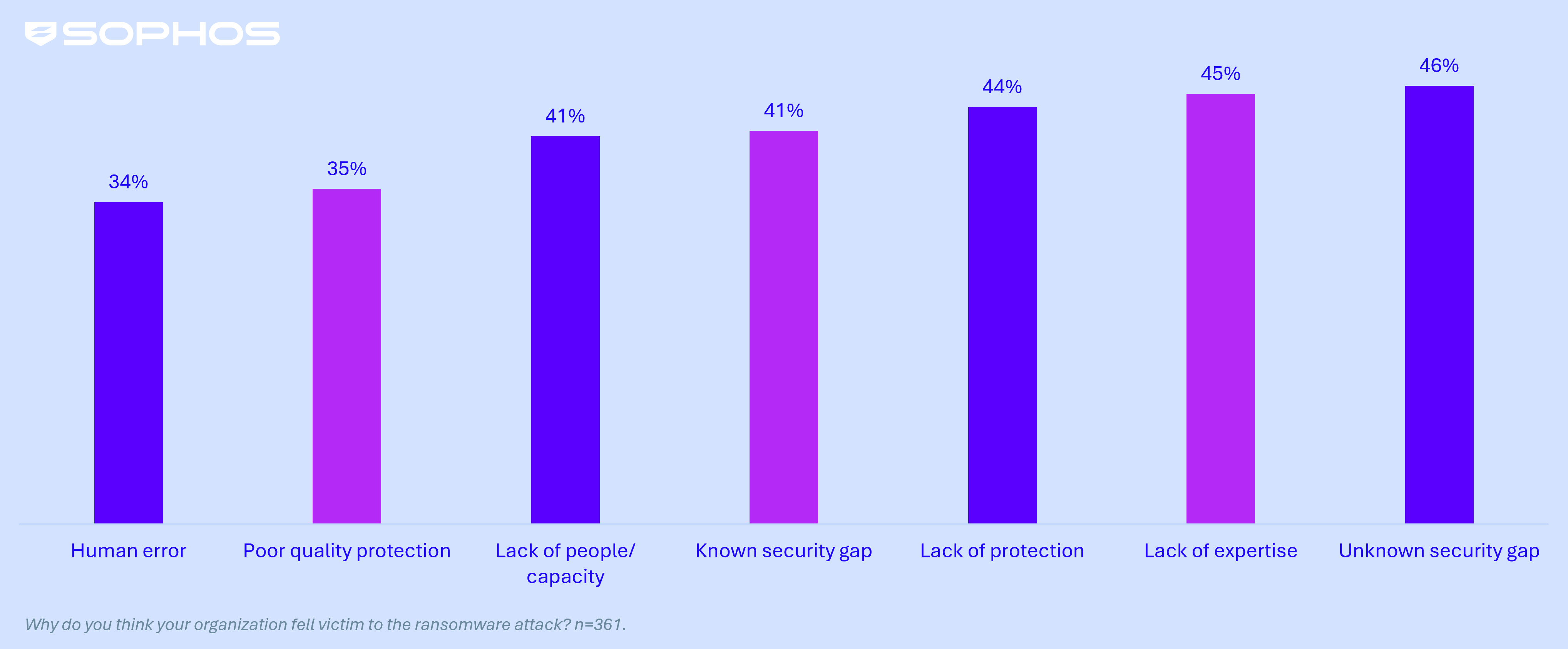 Diversi fattori organizzativi contribuiscono a rendere le organizzazioni vittime di ransomware, il più comune dei quali è rappresentato da lacune di sicurezza sconosciute, citate da quasi la metà (46%) delle vittime. Segue a ruota la mancanza di competenze, che ha contribuito al 45% degli attacchi, il tasso più alto registrato in tutti i settori oggetto dell’indagine.