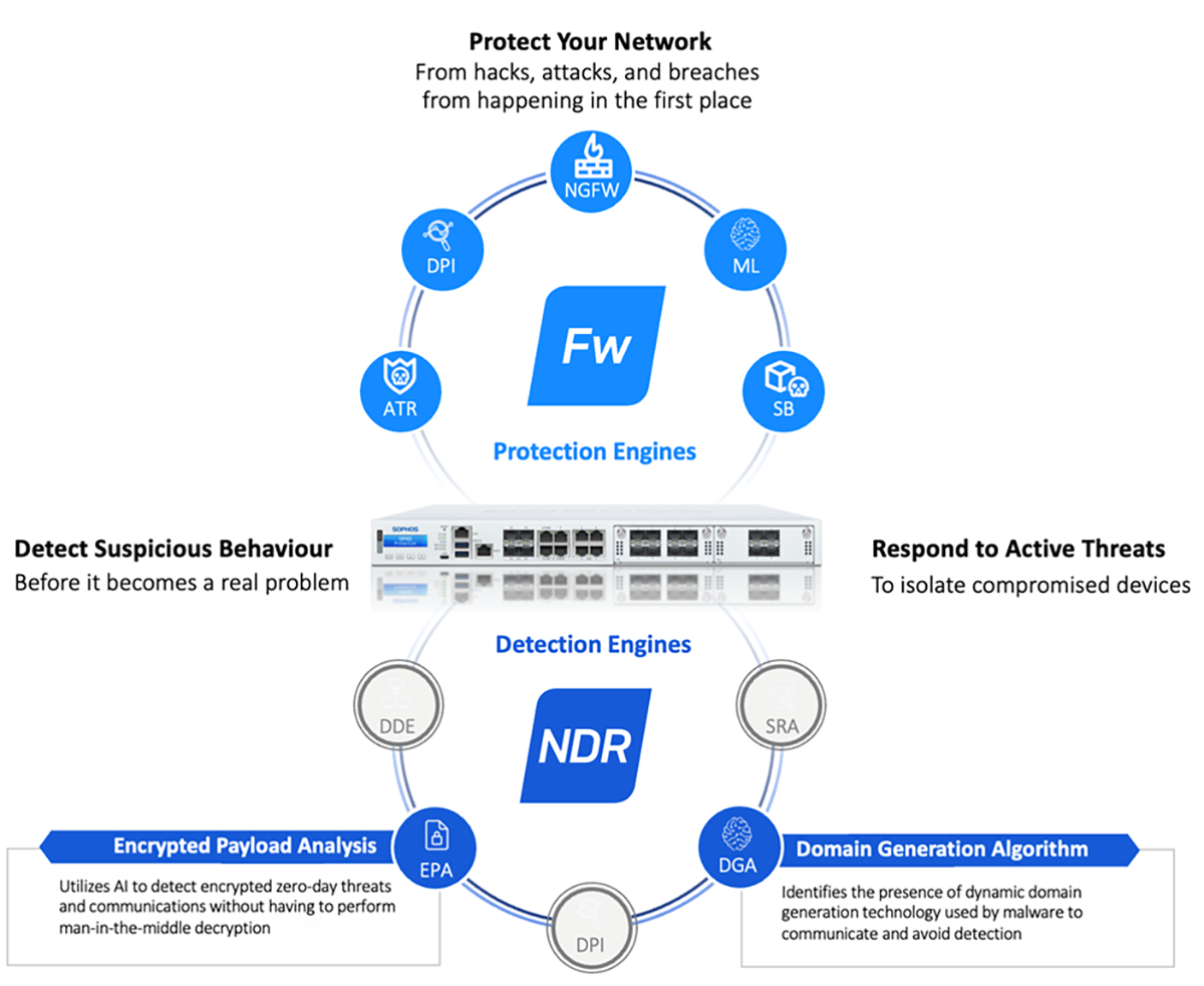 Sophos Firewall raccoglie metadati dal traffico TLS crittografato e dalle query DNS, e li invia alla nuova soluzione NDR Essentials nel Sophos Cloud, dove vengono analizzati tramite i motori IA DGA (Domain Generation Algorithm) e EPA (Encrypted Payload Analysis).