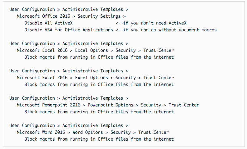Si noti che le impostazioni VBA di seguito (VBA è l’abbreviazione di Visual Basic for Applications, noto anche come “codice macro di Office”) non aiutano direttamente con lo zero-day CVE-2021-40444, che si basa su ActiveX, ma vale la pena considerando come una parte aggiuntiva della sicurezza di Microsoft Office.