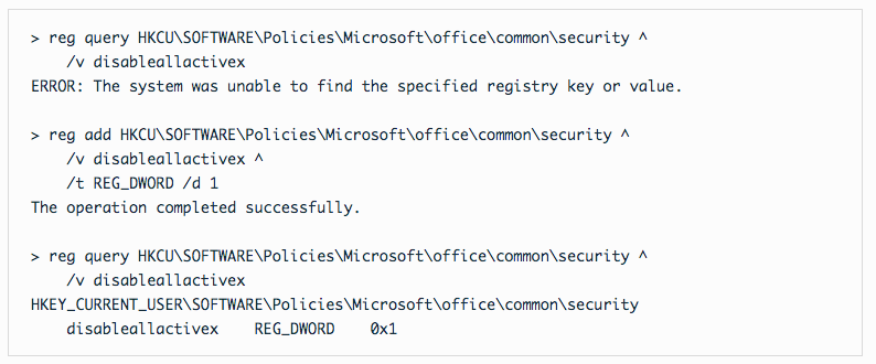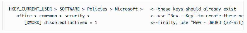 - Disabilita l’uso di ActiveX in Office. Se non hai affatto bisogno di ActiveX in Office, questo aiuta non solo a fermare questo attacco, ma anche a bloccare l’abuso di ActiveX da parte di altre minacce trasmesse da Office.