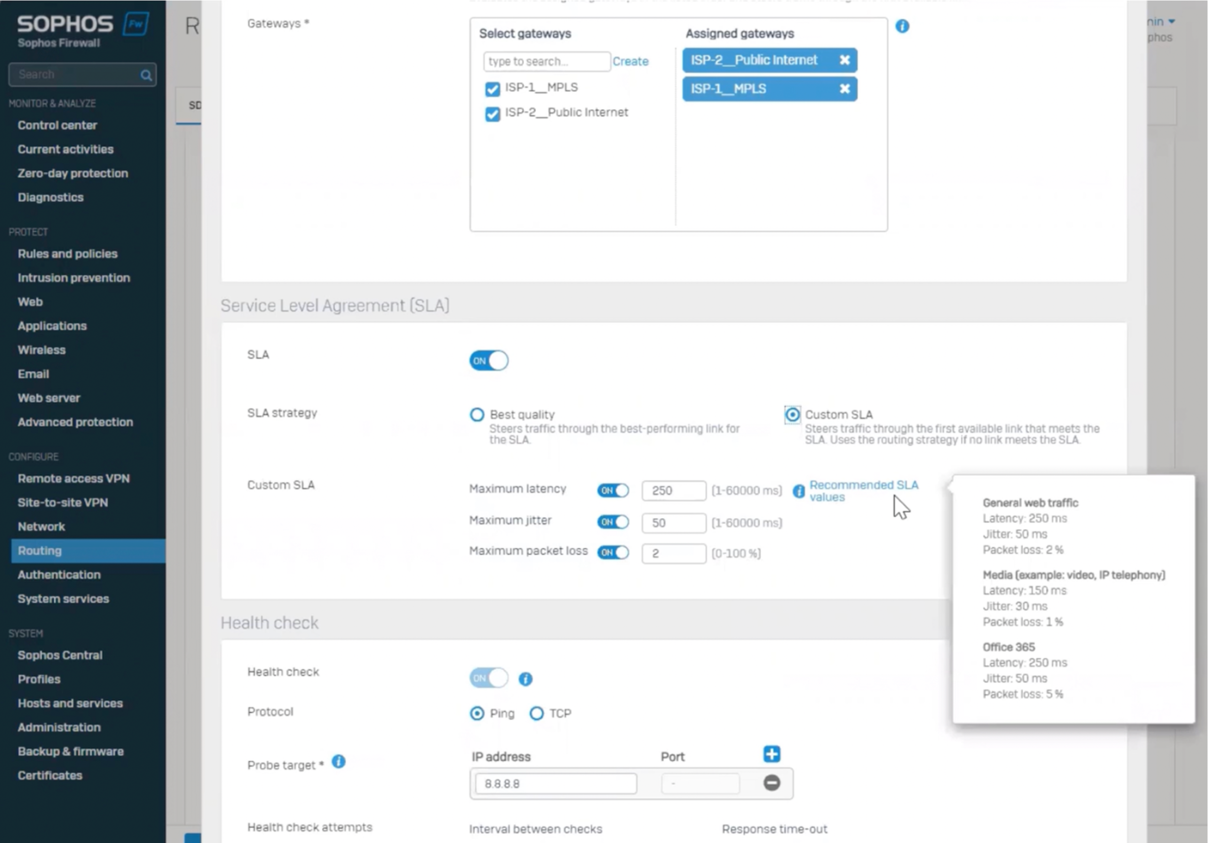 SD-WAN profile routing strategies can be based on first available or performance-based link criteria. Performance monitoring criteria includes jitter, latency and packet loss and can utilize multiple probe targets for PING and TCP probes. SD-WAN profiles automatically select the best link based on performance or according to your custom SLA policies that define specific values for maximum acceptable jitter, latency, or packet loss before re-routing over a better performing link.