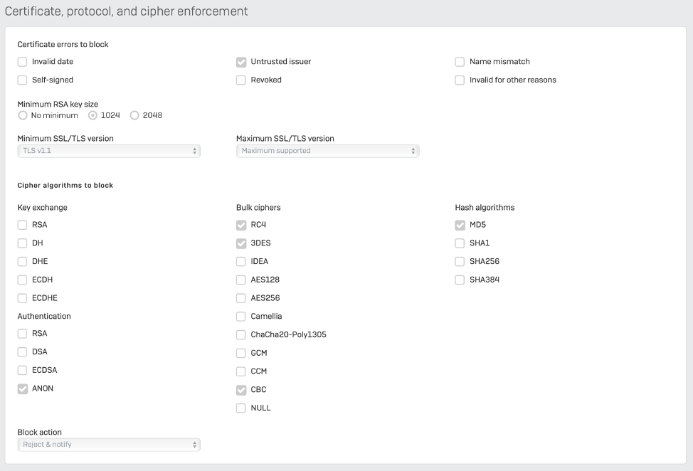 XG Firewall also offers among the best controls in the industry for handling insecure and legacy cipher suites thanks to comprehensive options as part of new Decryption Profiles that can be used in your TLS inspection rules.