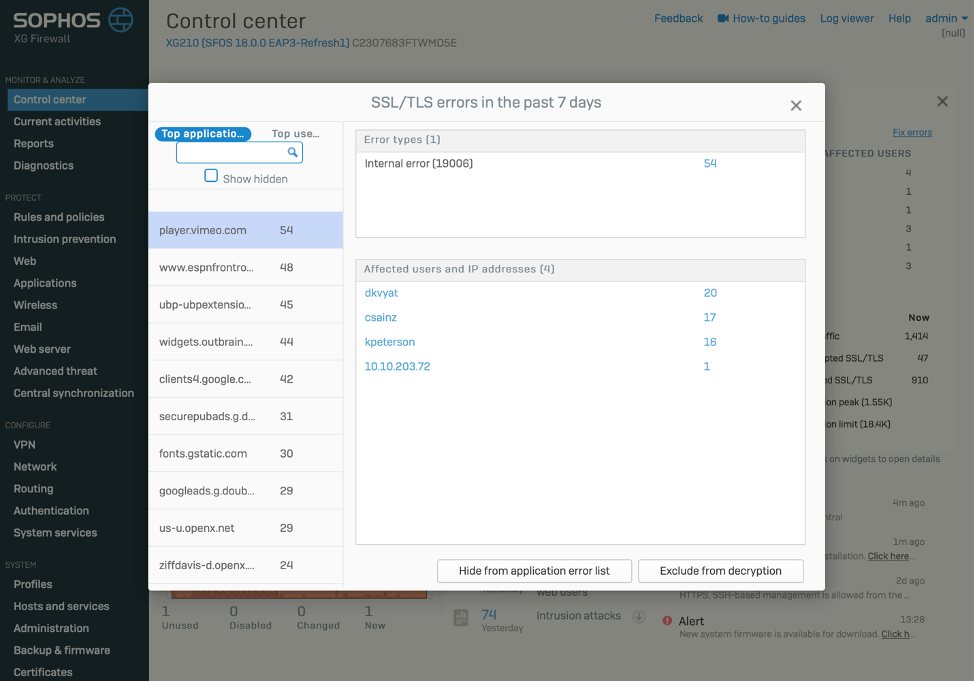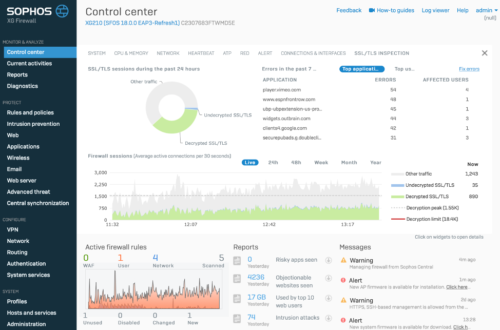 XG Firewall is unique in providing unprecedented visibility into encrypted traffic flows. As soon as you login, you can see at a glance the volume of encrypted traffic on your network, how much is actively being decrypted and if there are any compatibility issues.