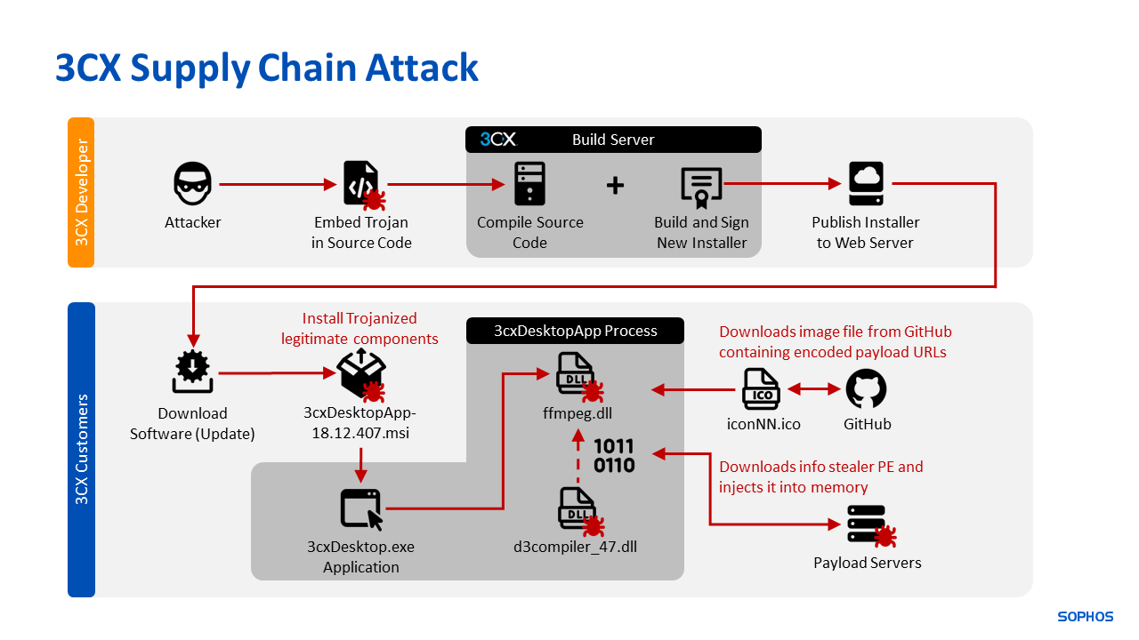 影響を受けたソフトウェアは、Windows、MacOS、Linux、Android、iOS で利用可能な正規のソフトウェアベースの PBX 電話システムである 3CX です。脅威アクターは、Windows と MacOS の一部のバージョンにインストーラーを追加して、さまざまなコマンドアンドコントロール (C2) サーバーと通信するように悪用しました。