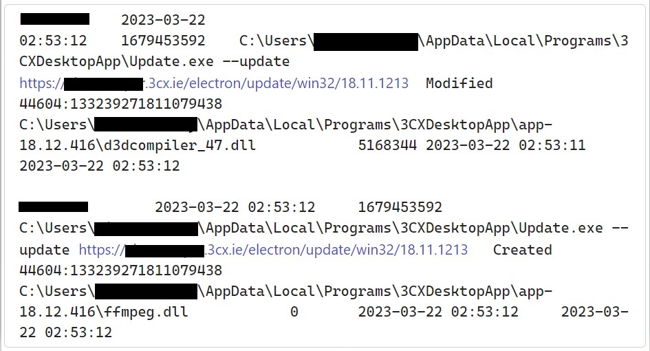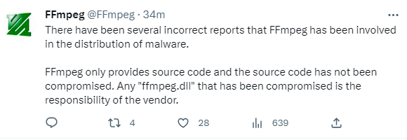 ffmpeg.dll ファイルには、3CX 独自の証明書で署名されたものを含め、いくつかのバリエーションが見られました。これらは、正規の ffmpeg.dll に悪意を持ってパッチを当てたものと思われます。木曜日の声明で、ffmpeg のソースコードに取り組んでいるチームは、3CX の侵害との関係性を避けるために注意を払っています。