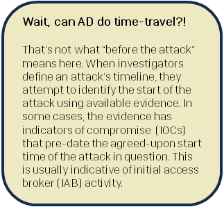 攻撃者が組織の Active Directory (AD) インフラにラテラルムーブメントを行うのに要した時間も、本レポートのために可能な限り収集しました。いくつかの事例では、「本格的な」攻撃が開始される前に、攻撃者が AD インフラにアクセスしたことが確認されています。また、被害を受けた組織が AD サーバーをインターネットからアクセスできるようにしていた事例など、AD サーバーの侵害から攻撃が始まったこともありました。