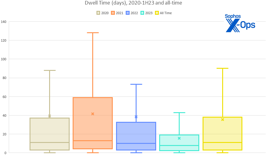 滞留時間は、最初のアクティブアドバーサリーレポートから追跡している指標です。この指標は、セキュリティチームがインシデントを検出して対応するまでの時間を把握するのに役立ちます。今回の調査期間では、全体の滞留時間の中央値が引き続き短くなっており、2022 年の 10 日から 2023 年前半には 8 日に減少しています。前回のレポートで述べたように、これは良いニュースでもあり悪いニュースでもあります。ソフォスは、検出能力の向上が滞留時間の低下に寄与していると考えており、これは良いニュースと言えます。つまり、多くの組織が早い段階でセキュリティ対策を組み込むようになり、対応に要する時間 (TTR) を増加させている結果として、検出までの時間 (TTD) が減少しています。悪いニュースは、このような傾向に対し、一部の攻撃者が活動を迅速化して対応していることです。