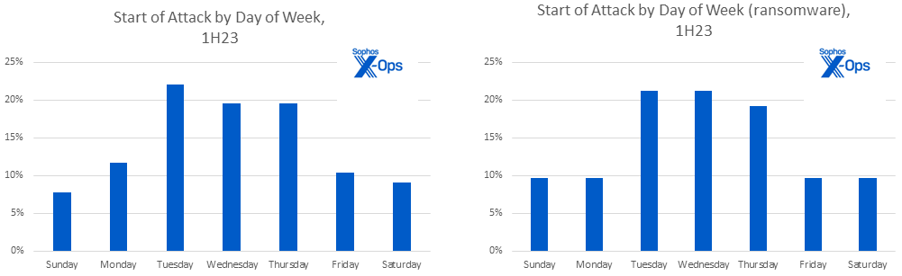 図 4:技術チームだけでなく、ビジネスリーダーとも連絡を取るのがより困難になるため、ランサムウェアの攻撃者は、週末を狙って攻撃を仕掛けている可能性があります。ソフォスが確認した事例の一部は、実際には週の初めに社内で発見されていたが、X-Ops のインシデント対応者には後から知らされたものである可能性もあるため、データの信頼性が若干落ちる可能性があることに注意してください。