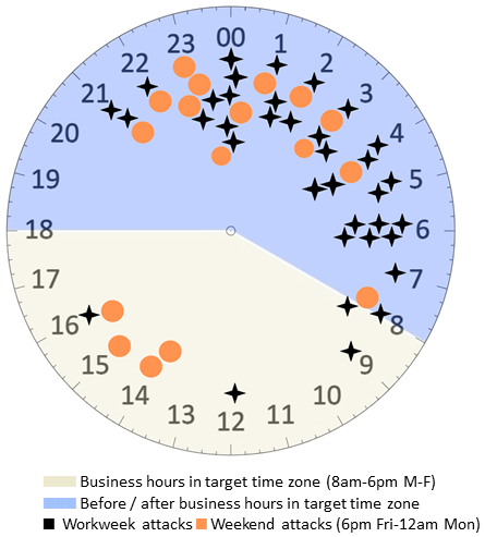 次に、これらのランサムウェア攻撃が展開されている時間帯を分析したところ、データから不都合な事実が新たに明らかになりました。(ランサムウェア攻撃に焦点を当てたのは、最も信頼性が高く、客観的な指標があるためです。)