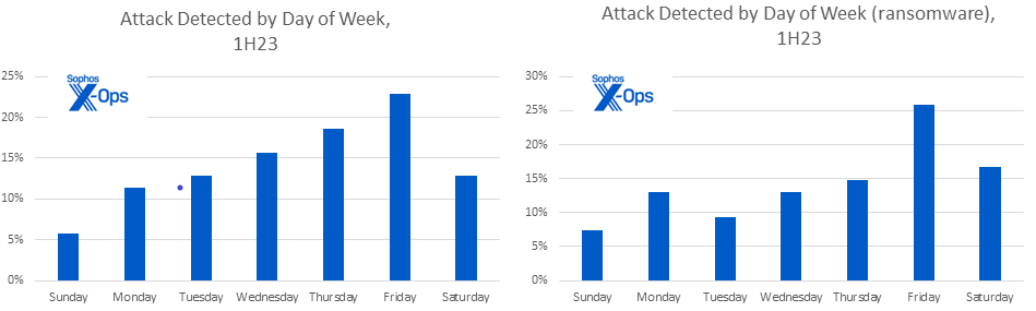 また、週の後半になるにつれて、検出される攻撃の数も着実に増加しています。ランサムウェア攻撃は金曜日に顕著に増加し、ランサムウェア攻撃の約半数 (43%) が金曜日または土曜日のいずれかに実行されたものでした。