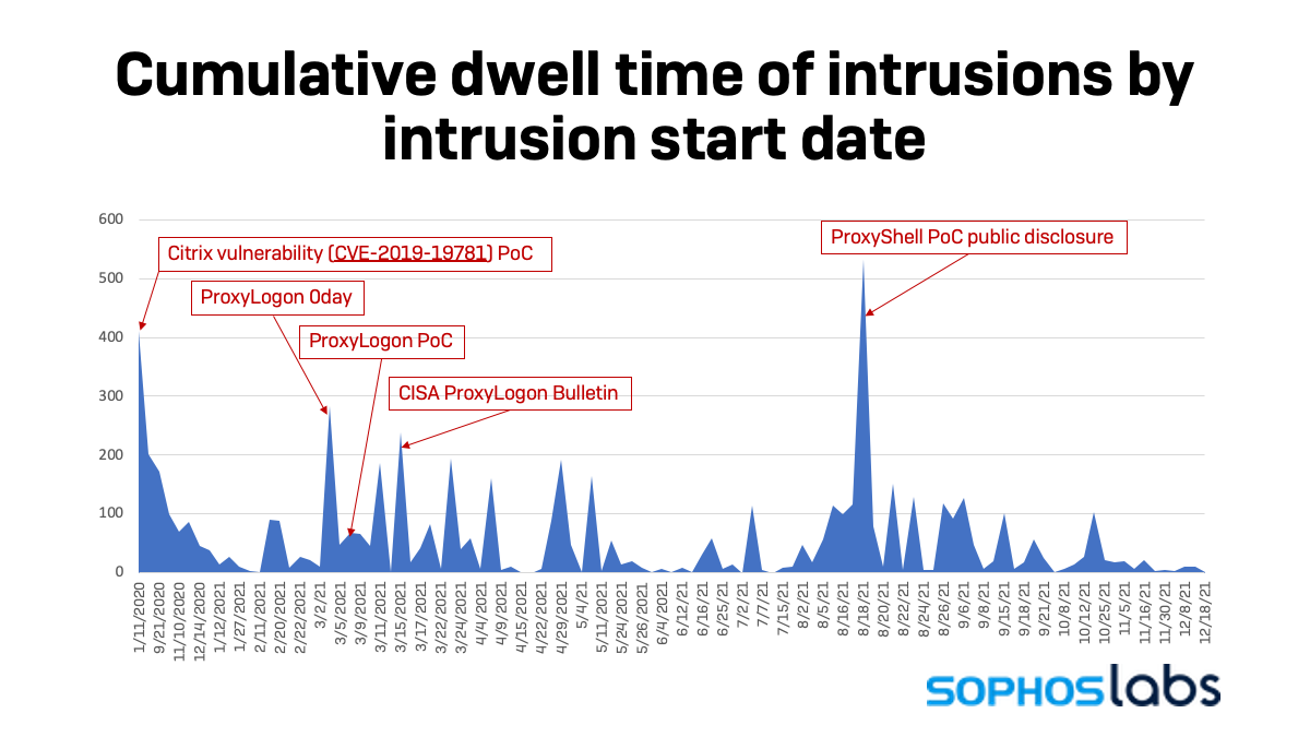 一方、大多数のセキュリティ侵害においては、Web シェルは長期間にわたって、被害者のネットワークへの確実かつ継続的なアクセスを確立するのに用いられています。これらの攻撃は、他の犯罪者に転売するためにアクセス権を収集している初期アクセスブローカー (IAB: Initial Access Broker) によって行われたものだと考えられています。IAB の目的は、被害者のネットワークに足場を固め、ランサムウェアのオペレーターなど、他の攻撃者にアクセス権を売却することです。最初の侵入から攻撃の発生までに何か月も間が空くこともあります。ProxyLogon や ProxyShell のような、広範に拡散しており、悪用が容易な脆弱性は、IAB にとって好都合なものです。攻撃に使われたアクセスのうち、どの程度が IAB から購入したもので、どの程度が最初から攻撃を意図して獲得されたものだったかは、今回のデータからは読み取れません。最初の侵害が発見されていなければ、ランサムウェア攻撃を受けていたであろう被害者の数も不明瞭です。
