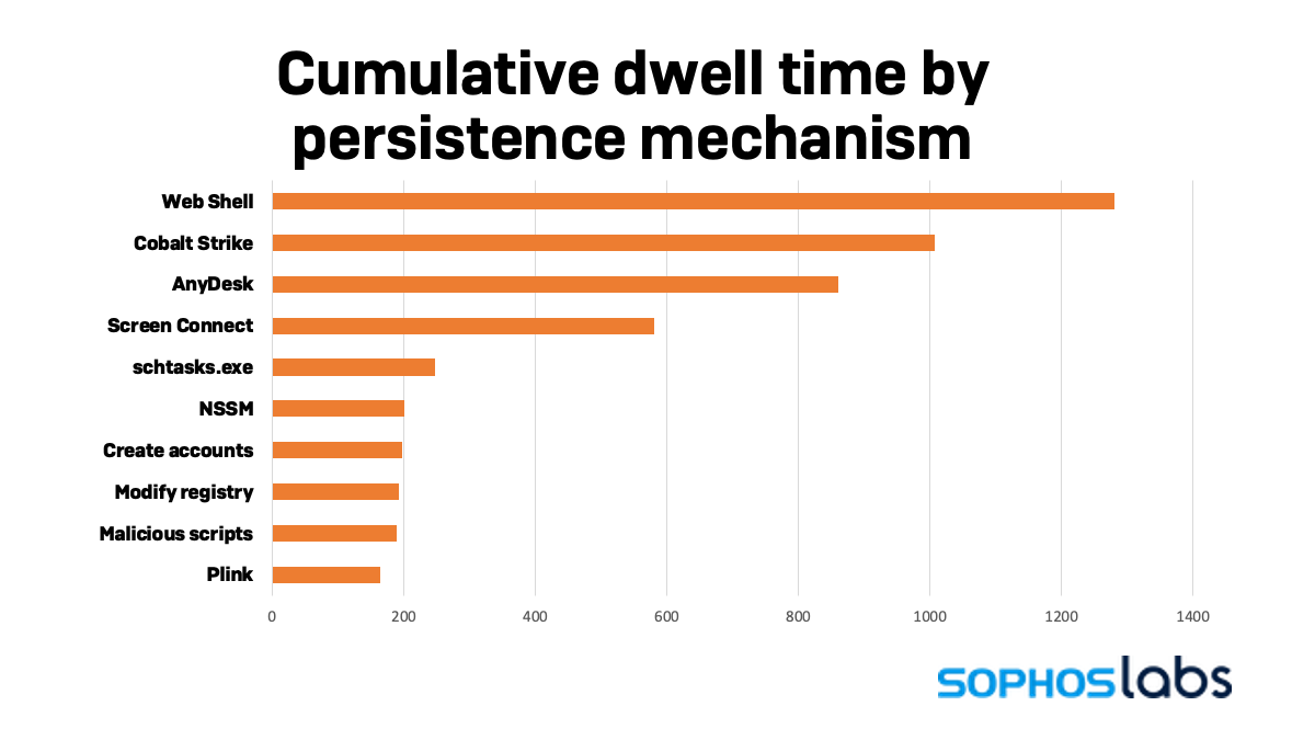 Web シェルを除外すると、滞留時間の平均値と中央値の両方がそれぞれ -20% および -33% と、明確に減少します。2021 年の全体での平均滞留時間は 42 日、中央値は 15 日でした。攻撃の種類から Web シェルを除外すると、平均滞留時間は 34 日に、中央値は 10 日に減少します。ステルス性を保ち、ネットワークに常駐するために Web シェルが用いられていることを考えると、この結果は当然です。