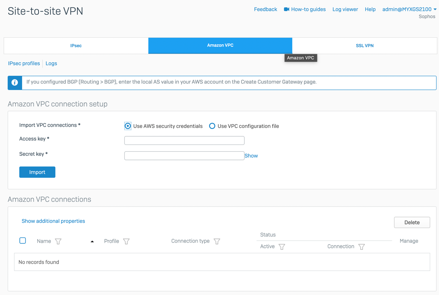 The new AWS VPC import feature enables the easy connection of your on-premise firewall to your AWS network infrastructure. You can now import the VPC configuration XML file from AWS to automate the tunnel setup on your Sophos Firewall, including related routing and the associated IPsec policies.