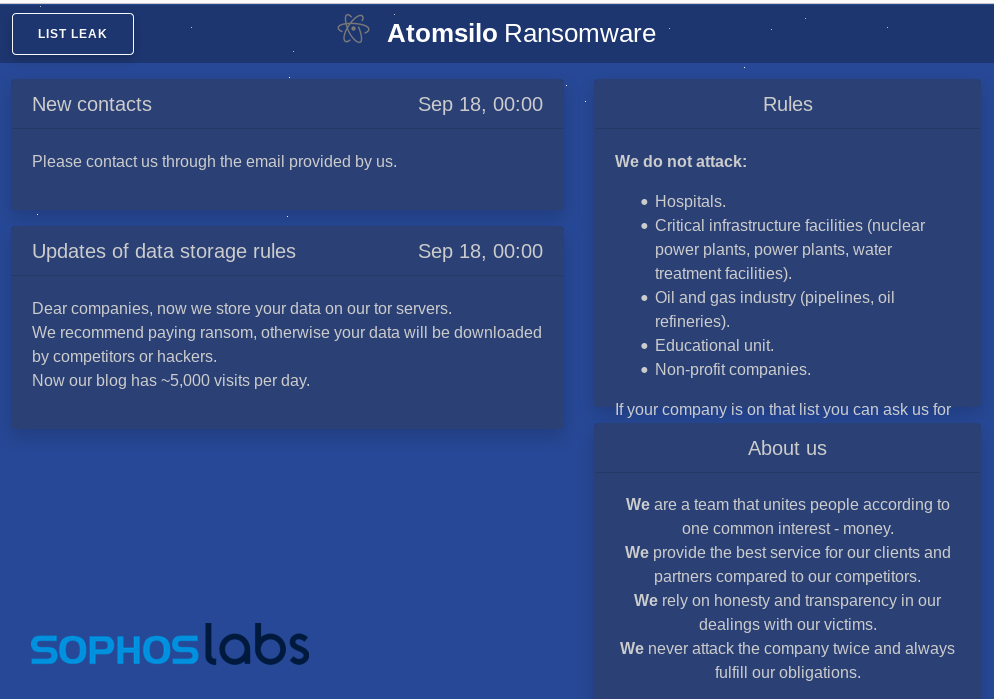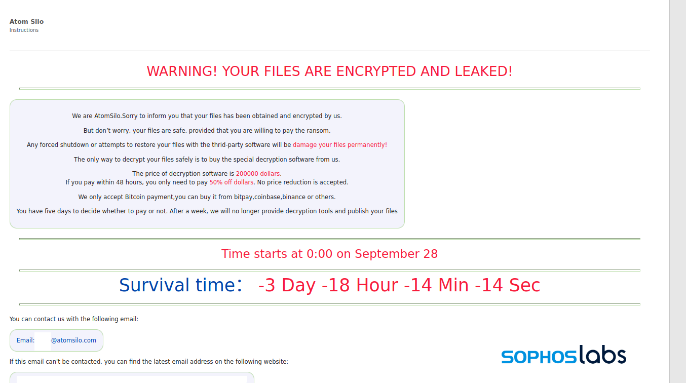 このランサムウェアの実行ファイル自体がリモートの URL (hxxp://139[.]180[.]184[.]147:45532/fake.php) に接続し、LockFile と同様の方法でファイルの暗号化を開始して、暗号化されたファイルに拡張子 .ATOMSILO が追加されました。このランサムウェアは、HTML でフォーマットされた身代金メモを、Atom Silo のオペレーターへの連絡方法の説明とともにドロップしました。
