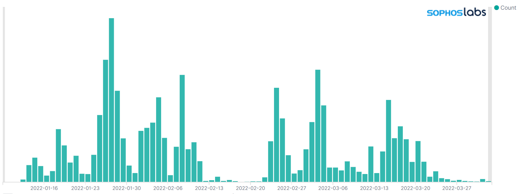 図 1 は、2022 年第 1 四半期にソフォスのサンドボックスシステムで検出された Emotet のペイロードの量を示しています。このグラフが示すように、ソフォスの元には Emotet のコピーが毎日いくつも届いています。いくつかの理由から、図に繰り返し出現している大きな山は、マルウェアの配信者による大規模な攻撃によるものだと考えられます。Emotet は主にスパムメールを介して配布されており、悪意のあるメールが増加すれば、当然サンドボックスへの送信も増えるからです。
