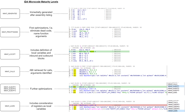 逆アセンブリ自体にパッチを当てたり操作したりする代わりに、Hex-Rays Microcode API を利用しました。Microcode は、Hex-Rays のデコンパイラで使用される中間言語です。デコンパイルの間、デコンパイラのプロセスはいくつかの異なるレベルを通過します。これらのレベルは、以下の図 6 に示されています。この API を利用すると、逆アセンブリに直接パッチを当てなくてもデコンパイルのプロセスを追加し、Microcode 上で操作できます。