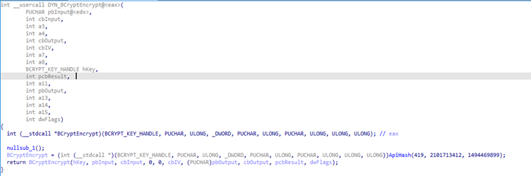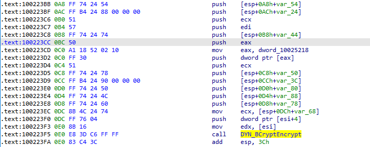 DYN_BCryptEncrypt 関数は、まず API 関数 BCryptEncrypt を解決して、この関数へのポインタを EAX レジスターに格納します。その後、call EAX という命令を介してポインタが格納された関数が呼び出されます。このメソッドでは、必要なパラメータを出力する代わりに、実際の EAX の呼び出しで使用されていない値をスタックに出力します。この操作により、通常よりも遥かに読みづらい関数シグネチャが生成されます。