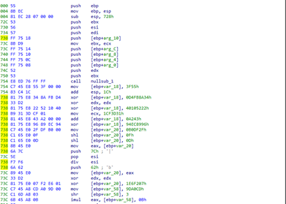 Emotet には、リバースエンジニアリングを妨害するためにジャンク命令が埋め込んであります。ジャンク命令とは、分析を複雑にし、手間をかけさせることを目的とした意味のない命令を指します。以下の図 11 にその一例を示します。