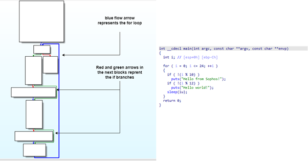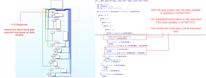 SophosLabs では、お客様を保護するため、Emotet の配布や配信に利用されている最も重要な戦術、技術、手順 (TTP) を常に調査しています。本記事では、Emotet の開発者がマルウェアのペイロードの検出とリバースエンジニアリング対策に使用している難読化手法の 1 つである制御フロー平坦化 (CFF) について分析します。以下では、単純な hello-world プログラムに CFF を適用した場合の簡単な例を示し、その後ソフォスの研究者が Emotet コードに施された CFF にどのように対処したかを説明します。最後に、調査中に遭遇した課題と問題点をまとめます。