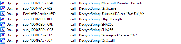 ほとんどの場合、API ハッシュ化関数の呼び出しと対応する動的な呼び出しは別々の関数に内包されています。対応関係の分析を自動化し、DYN_ という接尾辞がついた関数は API のハッシュ化を介して実行時に決定される関数であることを突き止めました。