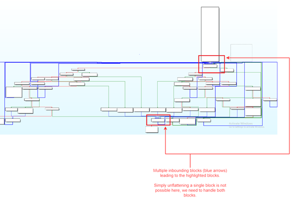 また、既存のアルゴリズムでは、すべての平坦化されたブロックにパッチを当てられない場合もありました。そこで、複数の関数を分析した結果、バイナリ全体で繰り返されるさまざまなパターンを特定しました。これらのパターンに従ってブロックを識別し、平坦化を元に戻すアルゴリズムを既存のコードベースに追加しました。最後に、コード全体を少し調整しました。以下が加えた変更の一部です。