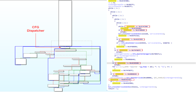図 3 と図 4 のデコンパイル結果を比較すると、複数の類似点が確認でき、上記のように CFG ディスパッチャーを特定できます。デコンパイル結果には、stateVar と注釈が付けられた変数が確認できます。図 3 のデコンパイル結果と同様に、stateVar は常に更新される状態変数で、次に実行されるブロックを決定するためにディスパッチャーによって使用されます。