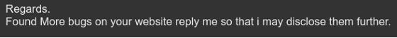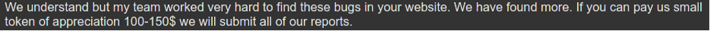 報告者は次の返信で、直接的に金銭を要求しています。「事情はお察ししますが、我々のチームは非常に多くの労力を費やして貴社の Web サイトのバグを発見しました。その他のバグも発見しています。もし 100~150 ドルの僅かな報酬をいただければ、すべてのレポートをお送りすることができます」![]()