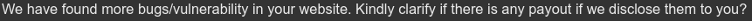 追って届いたメールでは、次のように述べています。「その他のバグや脆弱性を Web サイト上に発見しています。これをお教えした場合に報奨金がいただけるかどうか、お知らせ願います。」
