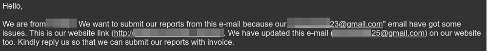 面白いことに、この報告者のアカウントは、被害にあった企業に連絡を取った直後に Google によって停止されています。再び企業に連絡が来たときには、アドレスを少し変えただけの別の Gmail アカウントを使用していました。