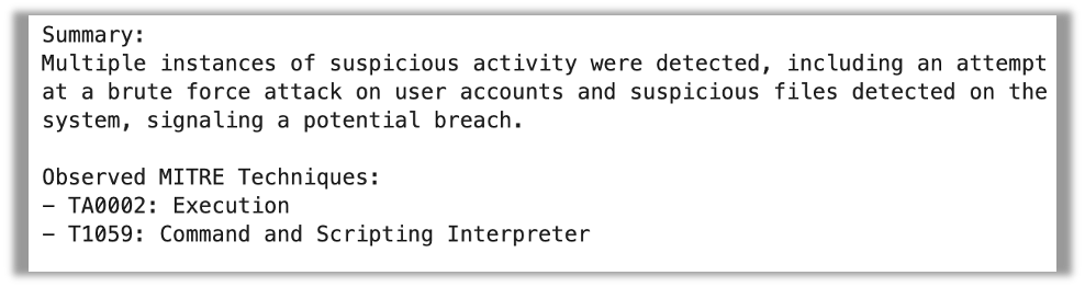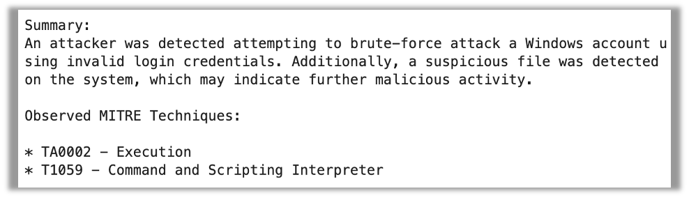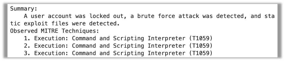 GPT-4 は質の高いサマリーを生成しました。記述は少し冗長でしたが、内容は正確でした。GPT-4 はまた、イベントデータから MITRE のテクニックを正しく抽出しました。しかし、MITRE のテクニックと戦術の区別を示すインデントは見落とされていました。
