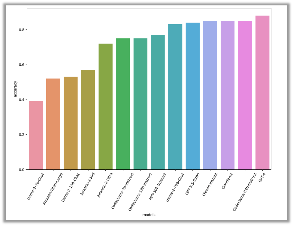 ソフォスの評価では、GPT-4 が 88% の精度で首位に輝きました。さらに、3 件のモデル (CodeLlama-34B-Instruct および 2 件の Claude モデル) が僅差で続きました。この 3 件はいずれも 85% の精度を記録しました。CodeLlama はコードの生成に重点を置いているため、このタスクにおける卓越した性能は予想されていました。