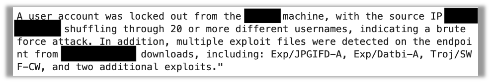 各モデルがどの程度イベントを要約できているのかについては、必ずしも数字がすべてを物語っているわけではありません。各モデルが何をしているのかをより詳しく把握するために、ソフォスはモデルによって生成された説明文を確認し、それらを定性的に評価しました。(お客様の情報を保護するため、生成されたインシデントサマリーの最初の 2 つのセクションのみを表示します。)