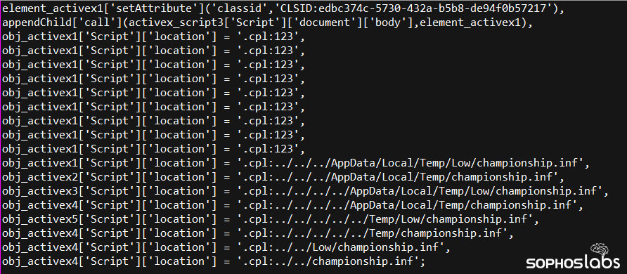 攻撃の手順は非常に複雑です。悪意のあるスクリプトは .cab ファイルから抽出される .inf ファイル (実際は悪意のある .dll) を実行するために .cpl ファイル用のビルトインハンドラ (Windows コントロールパネル) を使用しています。