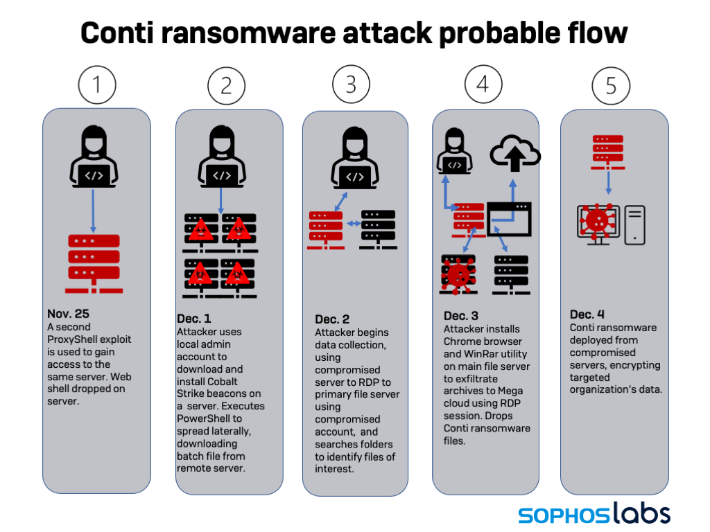 ランサムウェアのアフィリエイトが ProxyShell を利用して被害者のネットワークに侵入した事例が最近いくつか確認されており、その中には Conti のアフィリエイトも含まれます。また、複数の攻撃者が同じ脆弱性を悪用して被害組織へのアクセスを得る事例も過去に確認されています。しかし、2 つのランサムウェアグループから同時に攻撃を受けた事例はほとんどありません。