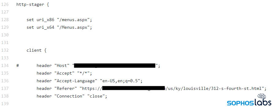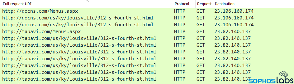 しかし、Conti の攻撃者がこのサンプルスクリプトを大幅に変更したようには見えないことから、この C2 通信は次の 2 つの点で注目に値します。このスクリプトでは、攻撃のこの段階で用いられる特性が指定されています。その 1 つである User-Agent 文字列 (“Mozilla/5.0 (Windows NT 6.1) AppleWebKit/537.36 (KHTML, like Gecko)“) は、Windows 7 が実行されてるコンピュータを模倣していますが、特定のブラウザーを識別することはできません。もう 1 つは、静的な URI パス (“/us/ky/louisville/312-s-fourth-st.html“) で、これには前述のリサーチャーが虫を発見したレストランの住所が含まれています。