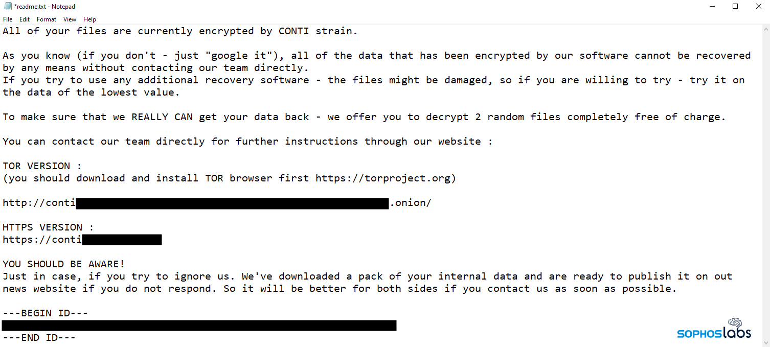 SophosLabs と Sophos Rapid Response チームは数か月前から、2020 年に初めて確認され、その後急速に進化しているランサムウェアの検出と動作分析を共同で行っています。「Conti」と名乗るこのランサムウェアは、反射型 DLL インジェクション手法を使用してマルウェアをメモリに直接挿入する Cobalt Strike/Meterpreter ペイロードの最後で配信されます。