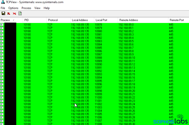 インシデント対応担当者がこのランサムウェアの動作を確認したところ、ファイルの暗号化プロセスを即座に開始すると同時に、SMB ポートを使用して近くのマシンに拡散する目的で、同じネットワークサブネット上の他のコンピュータへの接続を順番に試みていました。