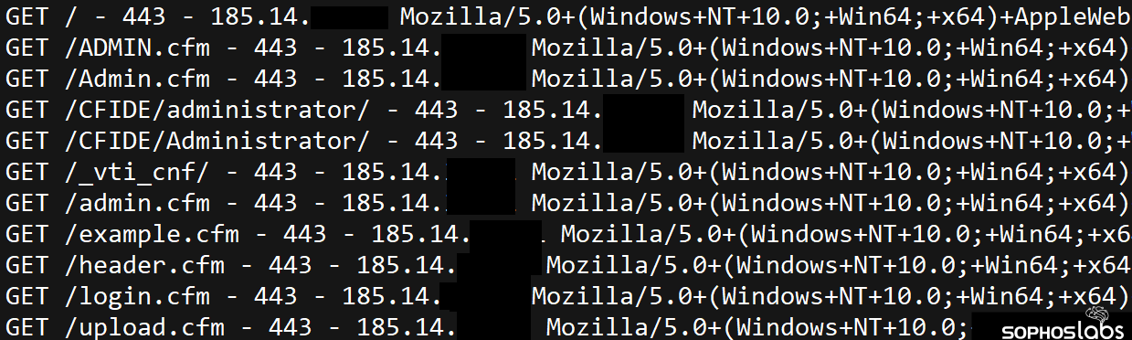 この攻撃は Web から始まりました。サーバーのログによると、ウクライナの ISP (インターネットサービスプロバイダー) である Green Floid に割り当てられたインターネットアドレスを使用した攻撃者が、現地時間午前 10 時前にターゲットの Web サイトのスキャンを開始し、自動化ツールを使用して、わずか 76 秒でターゲットである Web サイトにある 9000 以上のパスの閲覧を試みていました。スキャンの結果、この Web サーバーは、/admin.cfm、/login.cfm、/CFIDE/Administrator/ など、ColdFusion をインストールしている環境に特有のファイルや URI があることが判明したのです。