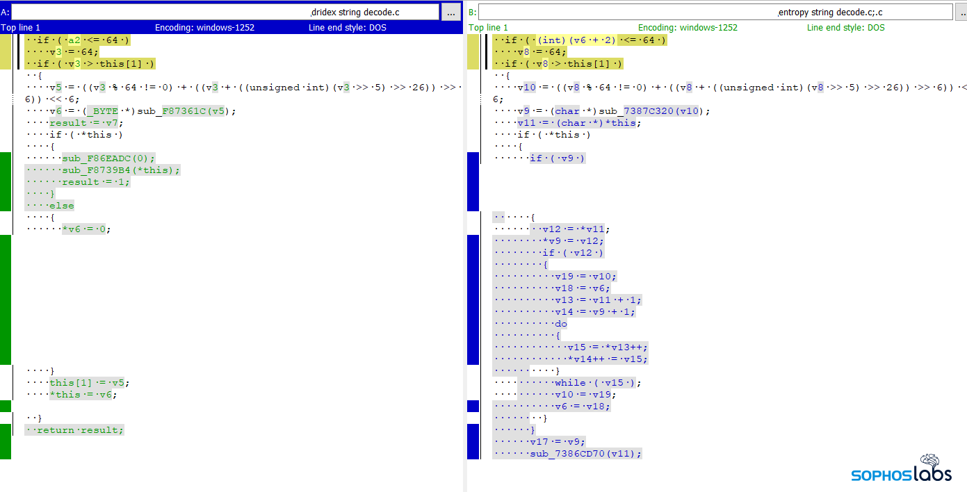 上記のスクリーンショットの左側が Dridex、右側が Entropy のサブルーチンです。これらの例のコードは、比較対照を容易にするため、アナリストによって大幅に整理されています。彼らは、文字列復号の仕組みがコードフローと論理構造の両面で 2 つとも基本的には同じであるとした上で、Entropy の方が「少しだけ最適化されている」と指摘しています。