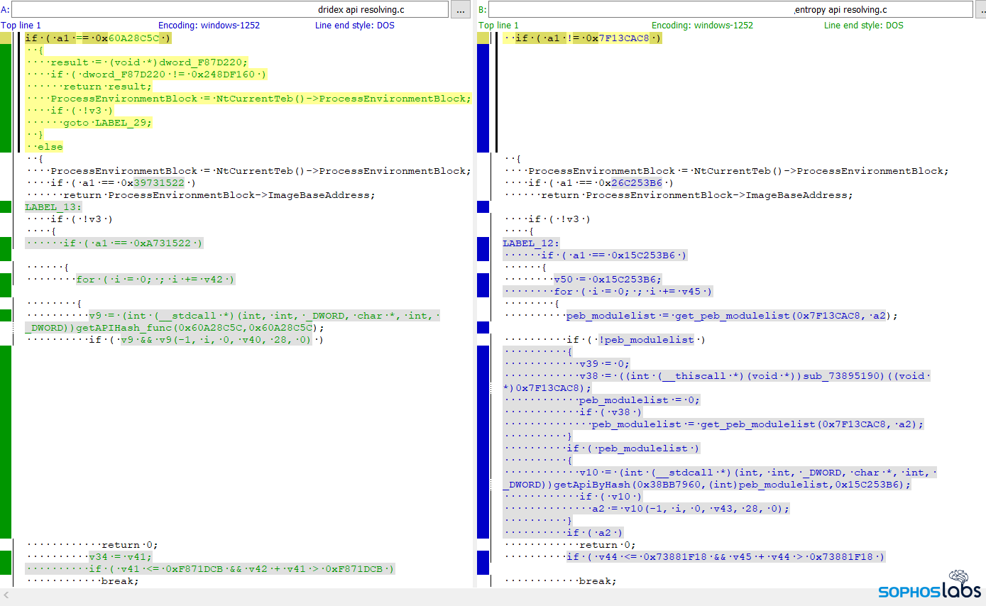 同様に、アナリストは Dridex と Entropy が API コールを解決するために使用するサブルーチンのソースコードも比較しました。小さな違い (たとえば、Dridex は 2 つのハッシュ値を入力として受け取るのに対して、Entropy は 1 つしか受け取りません) は存在するものの、「ウォーキング (利用可能なすべての API を探索すること)」を行い、プロセス環境ブロック (PEB) およびモジュールリストを解析する仕組みは非常によく似ていることが指摘されています。