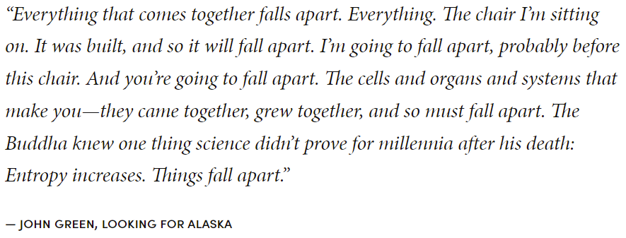 些細なことですが、もう一つ注目すべき点があります。ランサムウェアによって復号された文字列が標的組織の名前で始まり、「…falls apart. Entropy Increases. ((標的組織は) ばらばらになる。Entropy は増え続ける。)」と続く一節を含んでいることです。この一節はランサムノートのメモにもどこにも書かれておらず、バイナリ内部にのみ現れます。これはどうやら、2005 年に発表された John Green の青年小説である『アラスカを追いかけて (Looking For Alaska)』の一節を引用しているようです。「Entropy increases. Things fall apart. (エントロピーは増大する。物事はばらばらになる。)」