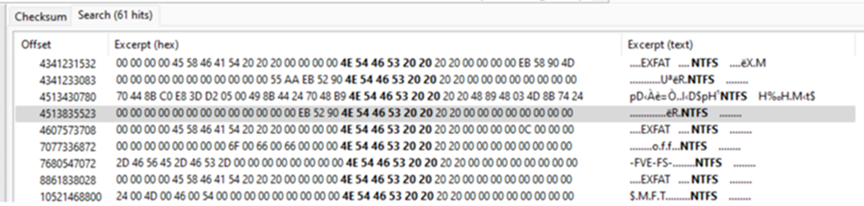 図 12: NTFS セクターの開始を示す 16 進数文字列を検索